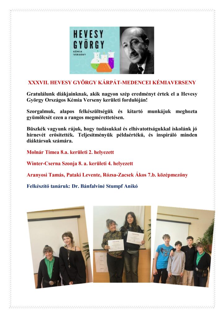 február 19, 2026Általános Iskola, UncategorizedAttila Gratulálunk diákjainknak, akik nagyon szép eredményt értek el a Hevesy György Országos Kémia Verseny kerületi fordulóján!