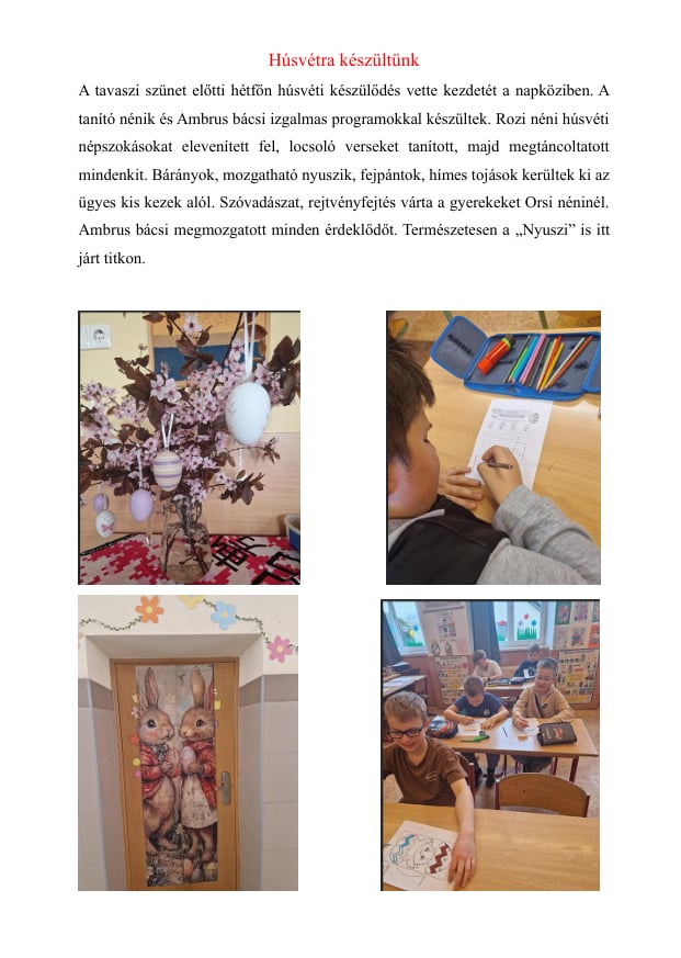 április 14, 2026Általános Iskola, UncategorizedAttila A tavaszi szünet előtti hétfőn húsvéti készülődés vette kezdetét a napköziben.