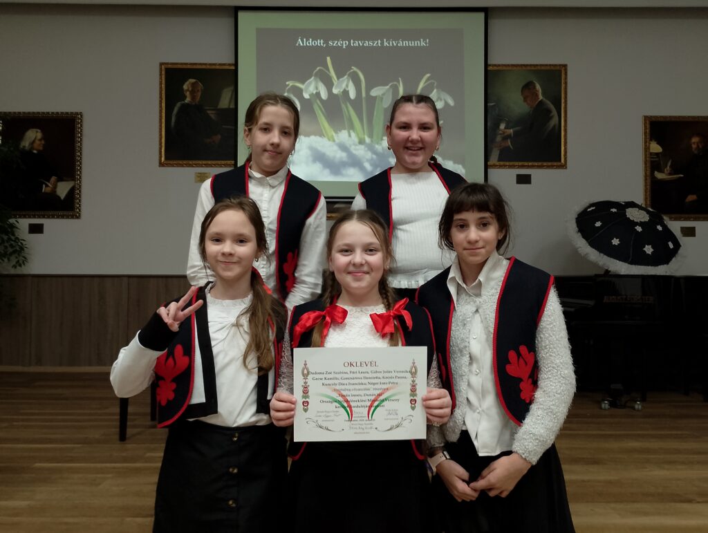 A „Tiszán innen, Dunán túl” Országos Népdaléneklési Minősítő Verseny kerületi fordulóján részt vettek az 5.A-s lányok és Bronz minősítést szereztek! 🥉